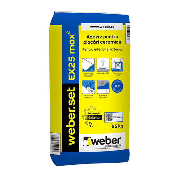 WEBER SET PORȚELANAT MAX2 este un adeziv de calitate profesională, sub formă de pulbere de culoare gri, pe bază de ciment, cu adaosuri minerale, fibre de armare şi răşini sintetice, aplicabil în pat subţire.